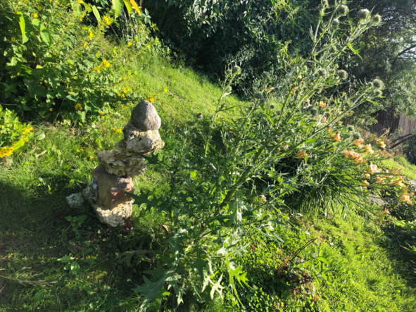 При этом, совсем высоко, медленно кружит семейство воронов – беззвучно, тем самым подключая сложносочиненную интонацию паузы, слегка сдерживая восклицательную вертикаль чертополоха.