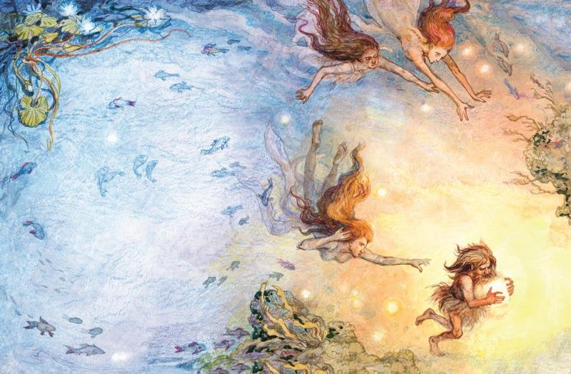 Внезапно его взгляд привлекает изумительное зрелище: сквозь глубины воды сверху льётся сияние. Оно становится ярче, мощнее, наконец, волшебный золотой блеск разливается повсюду.