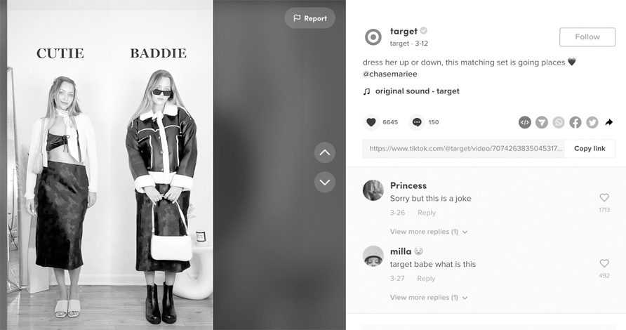 Сеть магазинов Target креативит на стыке подборок и «до и после». На экране появляются две копии девушки, в одной и той же юбке. Над первой подписано “cutie” (милашка), над второй “baddie” (злодейка). Остальные предметы гардероба ритмично появляются на героинях в соответствии со стилем. Так магазин показывает универсальность модели юбки.