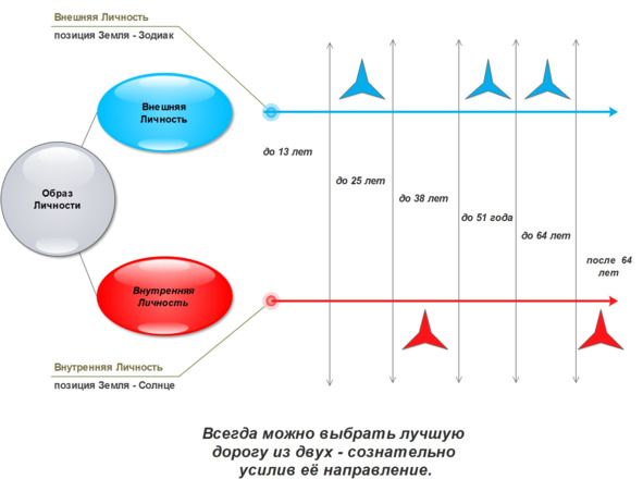 Вот, эту схемы Вы уже видели, она показывает, что Вы в себе несёте потенциал двух личностей: Внутренней и Внешней. Каждая из них имеет развертку судьбы. Помните, я там выше что-то начинала говорить про пятое измерение, вот это из этой темы. Так вот, по развертке (в её упрощённой форме) каждые 12—13 лет у Вас будут распаковываться, материализовываться на жизненном пути некоторые виды Энергий, которые в человеческом мире проявляются как внешние События и Ваши внутренние Состояния. Они будут иметь как положительные, так и отрицательные моменты, и Вы, имея в себе две таких развертки, можете сознательно выбирать более эффективный и желаемый для Вас вариант развития событий.