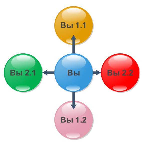 Если, Вы ещё не совсем запутались и способны воспринять усложняющийся рисунок, то я напишу Вам дополнительные четыре «Боковых Личности», в которые Вы будете попадать при возникновении стрессовой ситуации (в первый раз). Пусть она никогда не возникнет, но факт упрямая штука и показывает, что у любого человека случаются «сюрпризы» от судьбы, которые изменяют его мир, и ему приходится тоже меняться. Считайте это, своим потенциалом. Он не раскрывается сам по себе, но если Вы захотите, или Вас сильно встряхнет жизнь, или Вы будете находится в средне, где лучше всего процветает именно «Боковая личность» то Вы сможете использовать её плюсы и минусы и надевать её, как одежду.