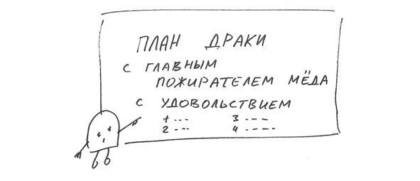 Тут Ме-одов спрыгнул со скамейки и, волоча за собой разрисованный хищными стрелами лист, решительно двинулся на лужайку. Там он развернул перед публикой свой грозный «ПЛАН ДРАКИ С ГЛАВНЫМ ПОЖИРАТЕЛЕМ МЁДА».