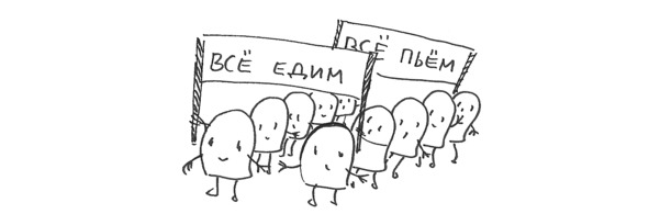 Подбегаю к дому, а там и вправду зоки стоят. Колонной как будто на демонстрацию собрались и плакаты держат «ВСЁ ЕДИМ» и «ВСЁ ПЬЁМ». Увидели меня, навстречу замаршировали, песню хором поют:
