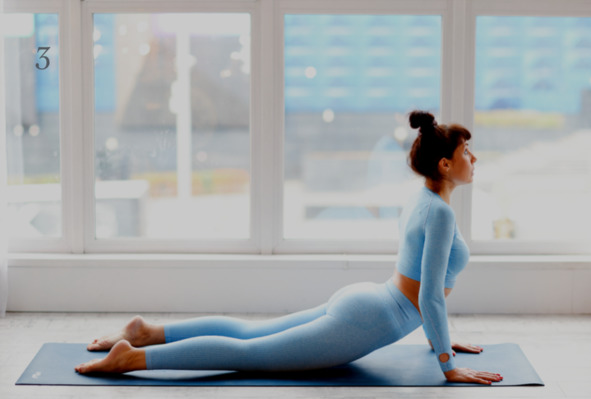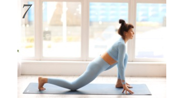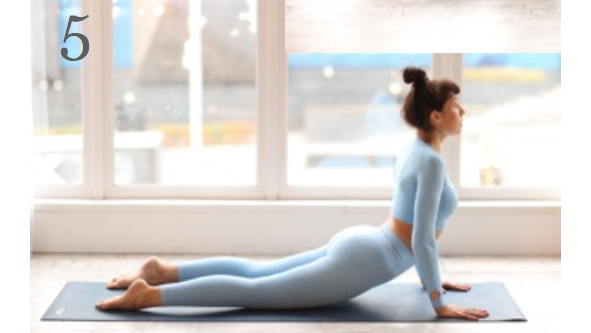 5. На вдохе опустите колени на пол, приподнимите грудь и посмотрите вперёд.