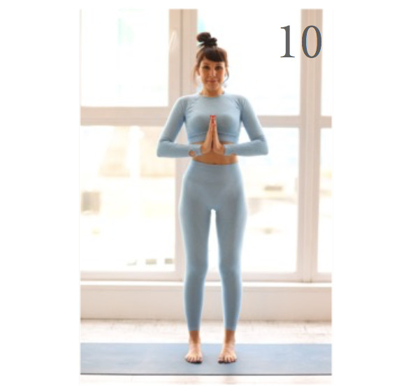 9. На вдохе, смотря вперёд и выпрямляясь, поднимите руки через стороны вверх, удерживая их параллельно одна другой, развернув раскрытые ладони внутрь.