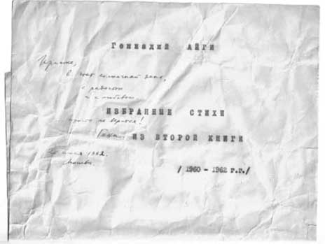 «Рукоположение» Пастернака, да и дежурства у дачного забора, не прошли ему даром. В институте его футболили из семинара в семинар – ни один из ведущих занятия советских литераторов не брал на себя смелость поддержать поэта, исповедовавшего иную литературную традицию, чурались его верлибров, «чужого», «не нашего» образного мышления. Последний год его приютил у себя на семинаре Михаил Светлов, не побоявшийся сказать о Гене, что это «наш Уитмен». Но все равно – диплом ему завалили (из-за «творческой несостоятельности». Он защитил его заочно, кажется, через два года). Начало 60-х было для него очень трудным временем. Он скитался по стране, не было дома, его не печатали. В 1960 году умерла его мать, которую он нежно любил. И он не смог приехать на похороны Пастернака 2 июня. Помню только его телеграмму из Чувашии, деревня Шаймурзино: «Здесь и там у меня все кончилось целую ваши руки».