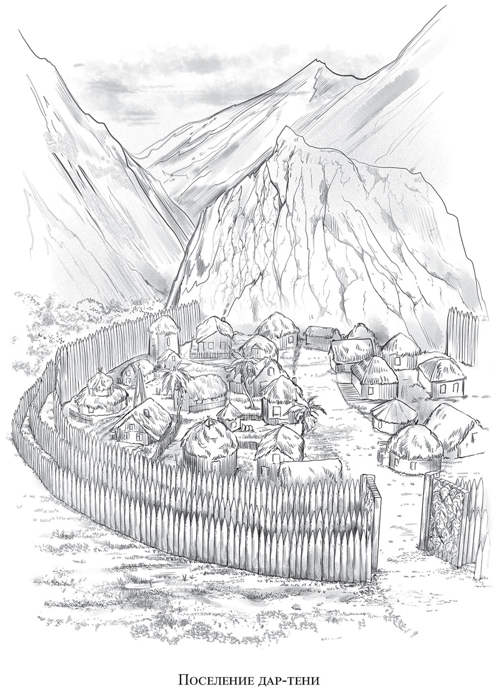 – Это старая защита от охонгов и пауков-лорхов, – объяснил профессор, заметив ее удивление. – Долгое время круги ограждения расширяли, это труд многих поколений дар-тени. Теперь даже если лорх случайно доберется сюда, внутрь он пробраться не сможет. Запрыгнет, соскользнет в промежуток между частоколом, застрянет, и его добьют. Здесь постоянно дежурят часовые. – Он кивнул на небольшие башенки за воротами, на крытых площадках которых виднелись вооруженные люди. – Если увидят опасность, трубят в рог, созывая жителей, и закрывают ворота.