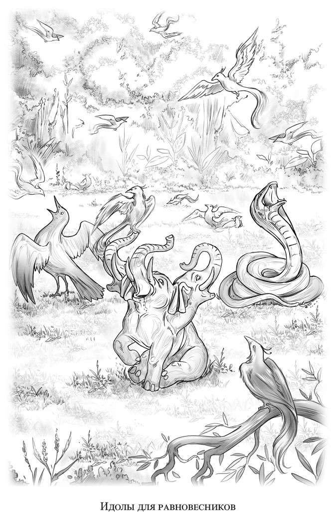 Свойственно это было только духам Разума, или равнове́сникам. Они, в отличие от порождений других стихий, почти не подражали животным – слишком основательны и гармоничны были для этого. Старшие из них, давно познавшие мир, не любили беспокойных людей и обитали далеко от городов и поселений. Иногда они принимали вид вечнозеленых деревьев – и такой гигант возвышался над лесом на сотню метров, а его корневая система гармонизировала окружающие земли; иногда – озер-колодцев, покоясь на их дне и поддерживая равновесие с помощью подземных вод. С этими духами, самыми загадочными и неизученными, было связано много легенд: например, что в их ветвях или на дне колодца можно найти чудесный артефакт или что любят они играть с путниками, давая им задания и щедро награждая за службу.