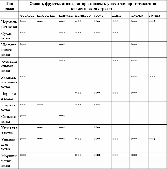 По приведенной ниже таблице вы сможете определить, какие фрукты или овощи подходят для вашей кожи. Используя их, можно приготовить прекрасные витаминные маски. Фрукты и овощи, созревающие осенью, содержат аминокислоты, витамины и масла, стимулирующие кожу и питающие ее необходимыми веществами.