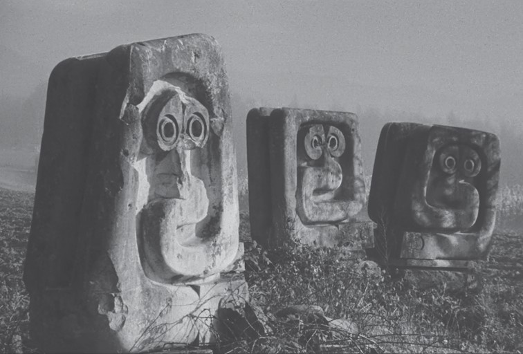 Этот проект рифмуется с прекрасной сценой из фильма Тео Ангелопулоса 1995 года «Взгляд Улисса», тоже касающегося вопросов поиска будущего в прошлом и прошлого, у которого было будущее. Герой фильма путешествует через Балканы как раз в эпоху распада и войн и в какой-то момент видит гигантскую статую Ленина, которую сплавляют по реке на барже. И вместо того, чтобы указывать вытянутой рукой в «светлое будущее», статуя тычет пальцем в небо. Но если поверженный Ленин у Ангелопулоса принадлежит очевидному историческому прошлому, то споменики воспринимаются, скорее, как следы несбывшегося будущего. Именно в этом качестве они предстают в фильме «Последние и первые люди», где выглядят столь убедительно фантастическими, что некоторые зрители приняли их за декорации или компьютерную графику.
