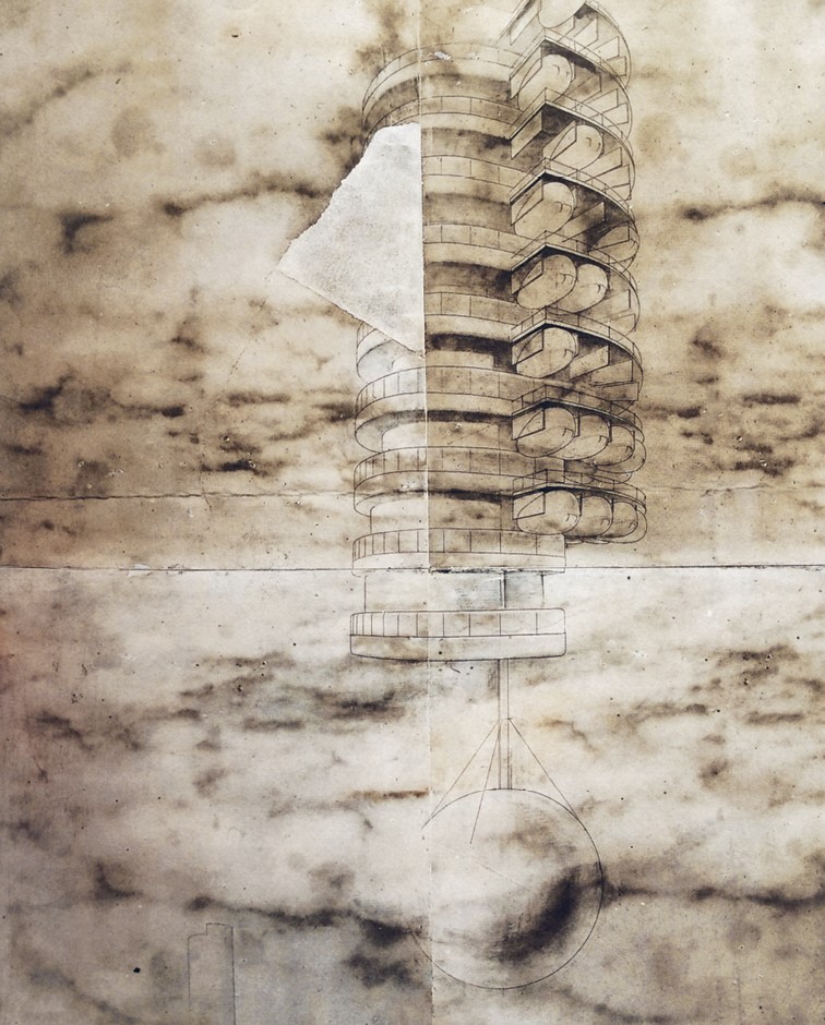Символ русского авангарда, «Летатлин» (1932), предлагает из мира, в котором уже давно функционируют самолеты, вернуться во времена Леонардо да Винчи и построить махолет. Но, наверное, самым невозможным проектом русского авангарда был «Летающий город» 1928 года – дипломная работа студента ВХУТЕМАСа Георгия Крутикова (1899–1958). Этот город свободно парит где-то вне орбиты, движимый атомной энергией. Георгий Крутиков полагал, что каждый общественный строй порождает свой тип города: феодализм – город концентрических кругов, как Москва, капитализм – прямоугольный Нью-Йорк; а будущее – многомерный город, который движется в воздушном пространстве и состоит из домов-коммун, сообщение между которыми осуществляется на специальных челноках.