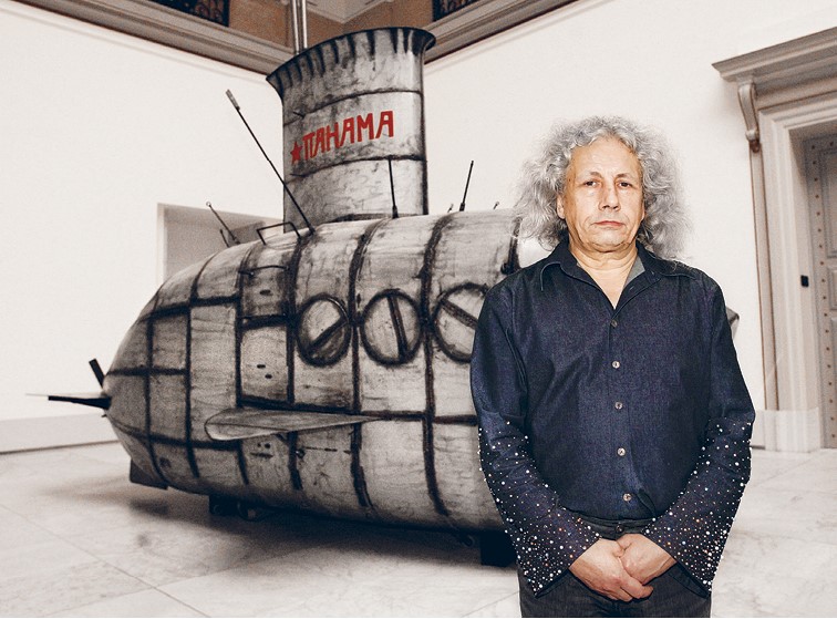 Панамаренко на фоне своего произведения «Панама. Шпицберген. Новая Земля» (1996 г.) на выставке в Брюссельском музее, 2006