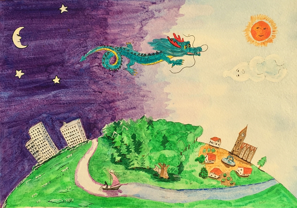Искрохвост не стал откладывать путешествие: тотчас же вытянулся в струнку и полетел вниз, в долину. Раньше он не спускался ниже ледника. А про жизнь внизу узнавал из стихов и песен, сочиненных людьми. Вместе с вложенной частью души певцов и поэтов они поднимались высоко в небо и служили драконам источником сил и знаний.