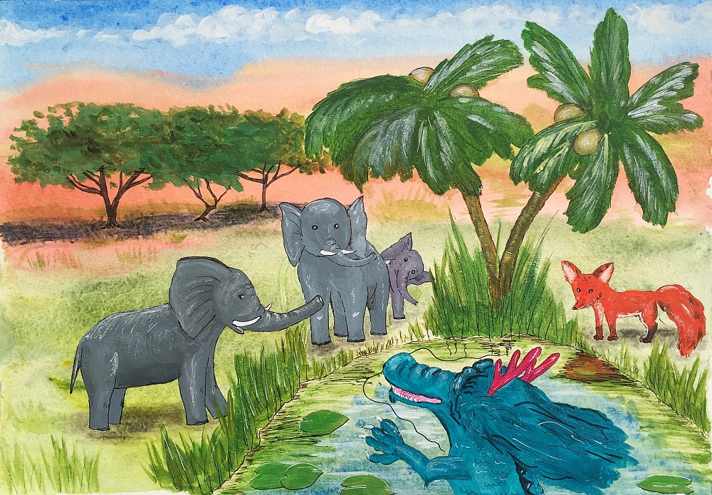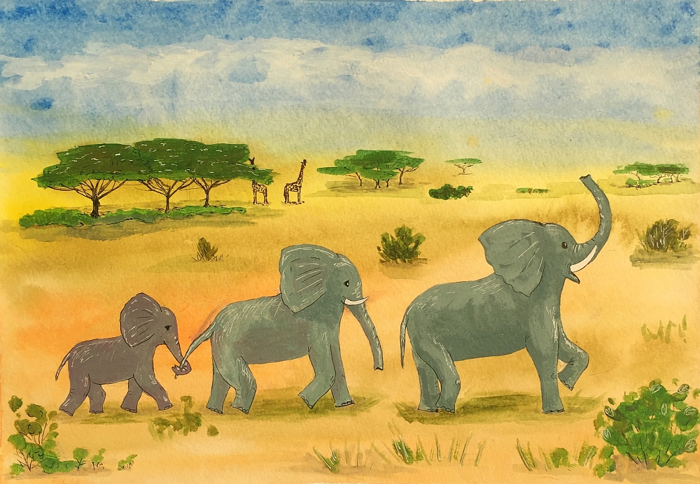 Прямо под ним шла вереница животных. Они уже не казались букашками – было видно, что они крупные и неторопливые. Плавно переставляют ноги, помахивают большими ушами и тонкими хвостами. Самый маленький из них шел в конце, обвивая длинным носом мамин хвост. Семейство направлялось к озеру, раскинувшемуся неподалеку под пальмами. Там, у водоема, прекращались все ссоры между животными, потому что они приходили сюда за самым ценным для жителей пустыни – за водой.