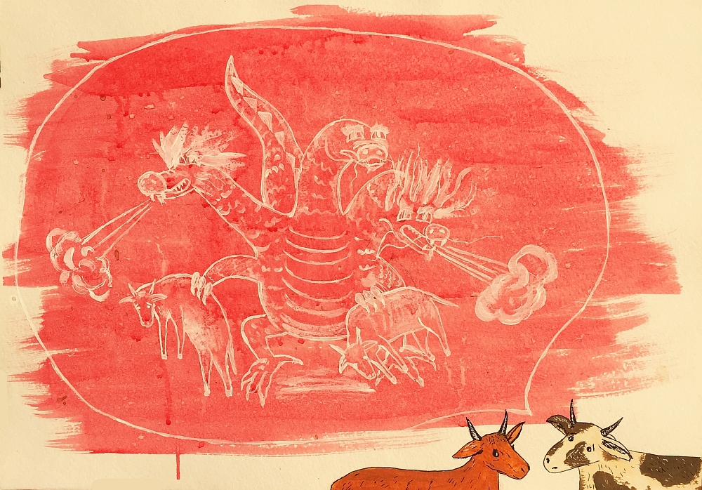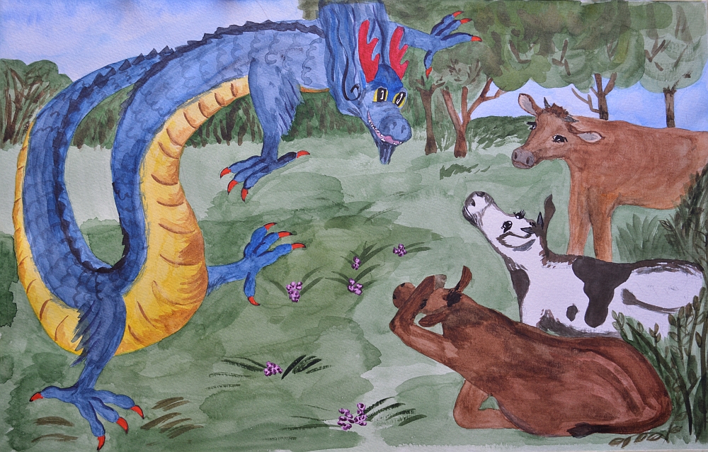 – Да-да! А обедали дюжиной барашков или парой коров, – дрожа всем телом, добавила черно-белая корова. – Я их не видала, но прабабушка рассказывала, что у драконов три головы. Они прилетали, кружили над стадом, выбирали самую упитанную из нас и уносили прочь. Как коршуны мышь!