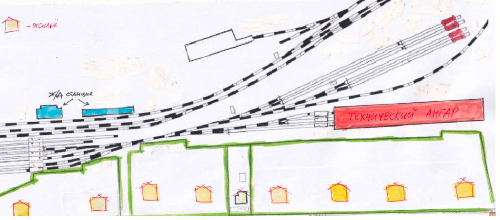 Рассмотрим один житейски грустный пример. Спор жителя частного дома с паровозным депо. На схеме ниже обозначены: зеленым – существующие заборы жилой зоны, оранжевым – технологический ангар, желтым – жилые домики и бордовым – тупики, где в не очень холодную погоду по ночам пребывают паровозы.