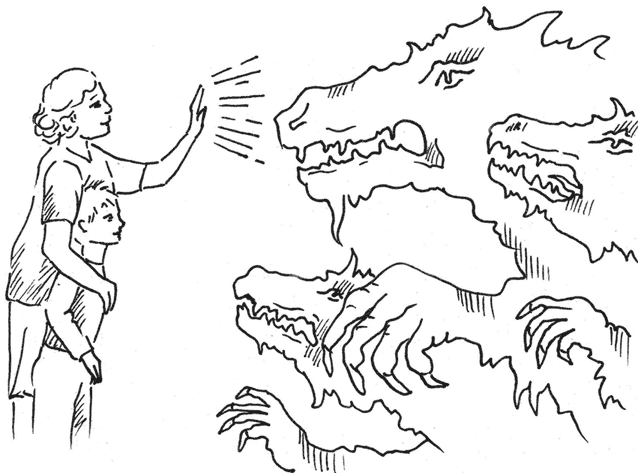 Компания страшилищ приосанилась и приободрилась, начала расползаться по стенам. От окна к старушке грозно подступила огромная чёрная тень. Малыш чуть не взвыл от ужаса. Но его бабушка не собиралась сдаваться. Голос её чуть дрогнул, но тут же снова обрёл уверенность: