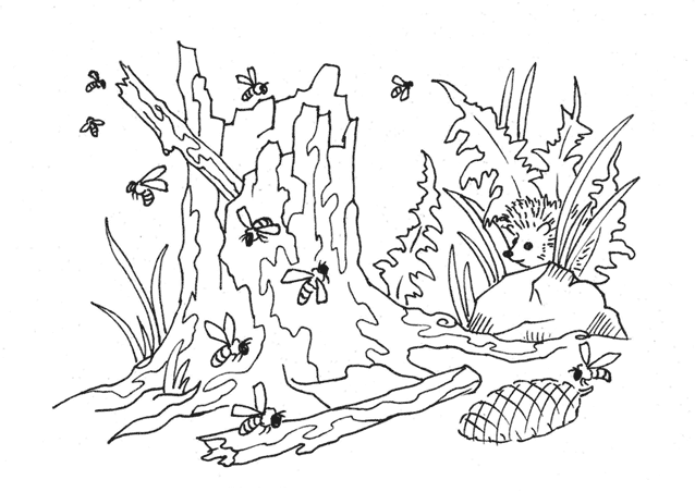 – О! Вот где едовые кладовые! – воспрял он духом и пошёл за ёжиком. Тот припустил от него во всю прыть. Мальчик упустил его из виду и, решив, что ёж спрятался в корнях пня, принялся яростно ковыряться в его трухлявом нутре. И тут вылетела одна оса, другая… С воплем мальчуган бросился бежать от целого роя лесных ос. Он бежал и бежал, пока не увидел ручей. Со всего размаху малыш влетел в воду, подняв фонтан брызг… И долго ещё плескался он, отгоняя насекомых, которые давно уже перестали его преследовать.