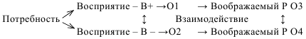 Модель конфликта между в равной мере привлекательной и непривлекательной для субъекта возможностью реализовать потребность (В – валентность, О – образ, Р – результат, ↕, → – локомоции):