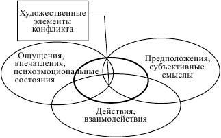 Воспользуемся классическим подходом к структурированию любого психологического феномена как результата интеграции сознания, переживания и деятельности и, полагаясь на результаты анализа структуры художественного образа, выделим область художественного в содержании конфликта: