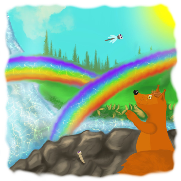 У подножия самой высокой горы белочка нарисовала замок. В башне у окошка девочку—дракона, которая смотрела вниз, на землю. Там стоял грустный дракон—мальчик. Почему грустный? Да потому что у него никак не получалось взобраться на башню, ведь крылья еще не выросли – и поэтому летать он не умел. Дракон—мальчик стал плакать. Слезы текли и текли из его глаз, и вскоре получилось небольшое озерцо. По нему поплыли красивые лебеди, разглядывая в глубине золотых рыбок с пышными хвостами. К озеру прискакали лягушки, прилетели бабочки. По берегам густые заросли камыша, а рядом на полянке цветочки.