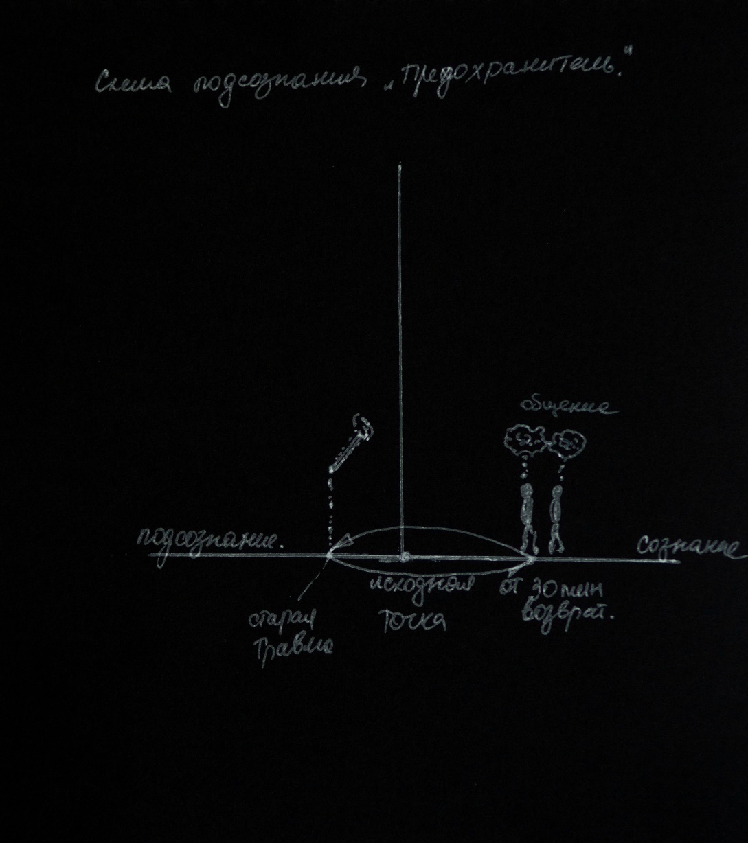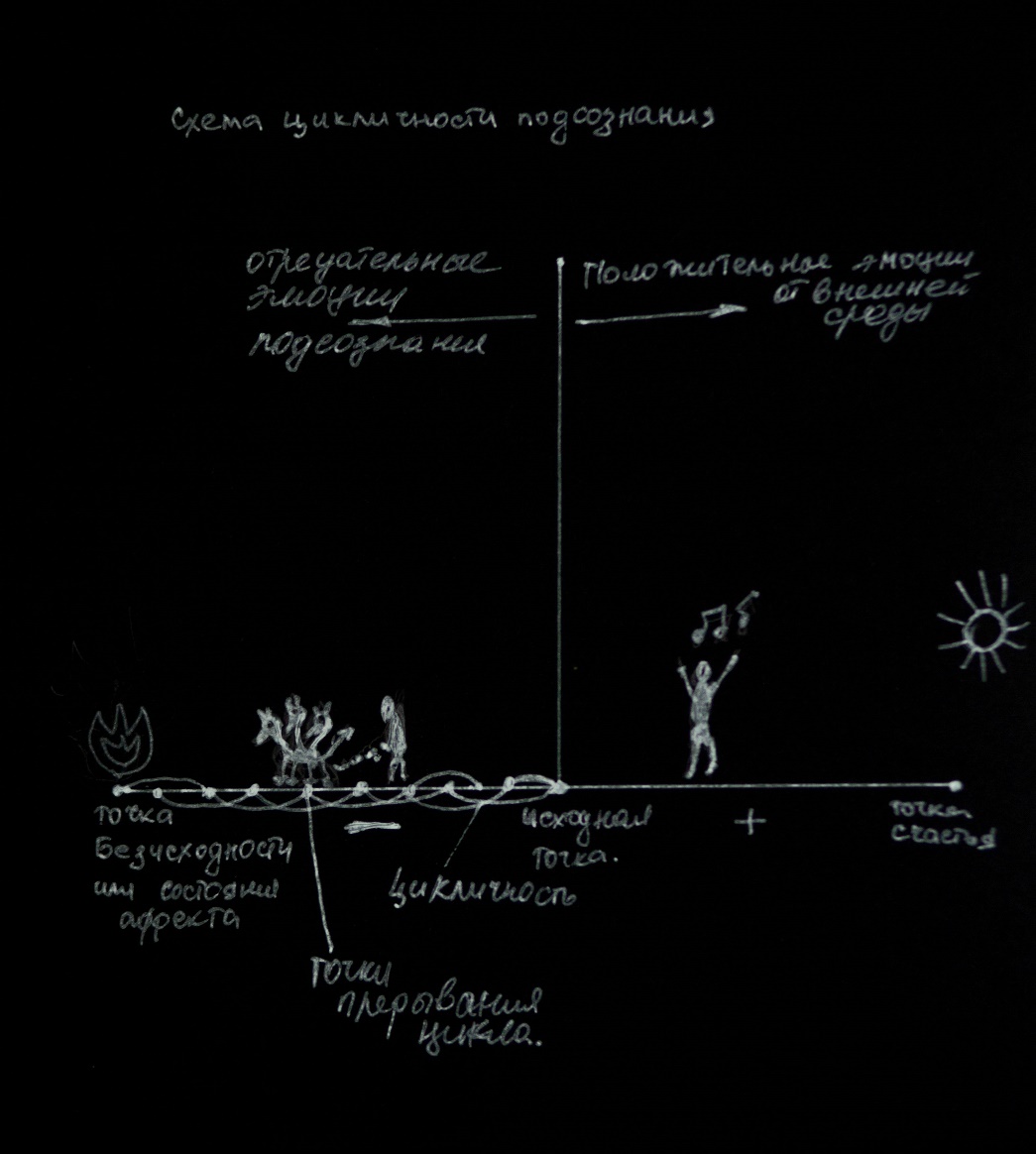 Что важно: если вы уже решили взять на себя процесс прерывания бессознательной цикличности, то в этот момент ни в коем случае нельзя "атаковать" в ответ или отвечать тем же. Если вас оскорбляют, нельзя отвечать тем же, это важно. Если отвечать атакой на атаку, оскорблением на оскорбление, то ничего не произойдет, точнее произойдет словесная перепалка, в результате каждый уйдёт со своим мнение и бессознательное продолжит свое движение в безысходность, эта битва или словесная перепалка ничем не закончится. Отвечать нужно обязательно, но нейтрально. В этот момент вы как бы подтягиваете сознание в исходную точку за собой, человек начинает постепенно успокаиваться, зачастую не понимая, почему вы не отвечаете тем же. Вывод сознания из данной формы безысходности – это весьма трудоёмкое и затратное по времени занятие. Цикличность нужно сбивать неоднократно, причем в ритме, не дожидаясь последующего автоматического зацикливания человека. Постепенно, все ближе подтягивая сознание к исходной точке, каждый раз добавляя резко положительные эмоции. Общее время вывода из бессознательного таким методом от 7 дней. Структура тяжелой формы бессознательного на рисунке ниже.