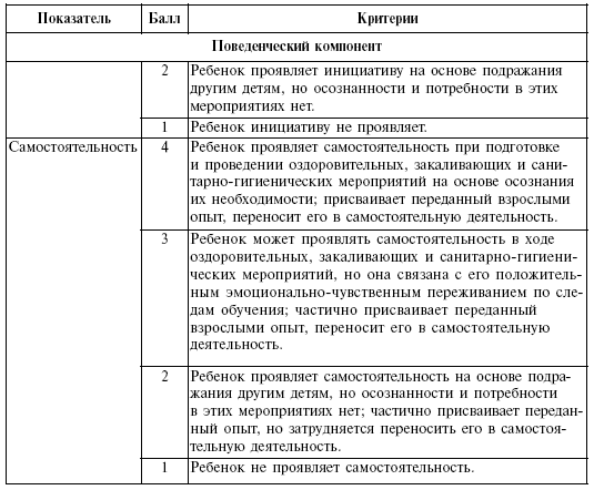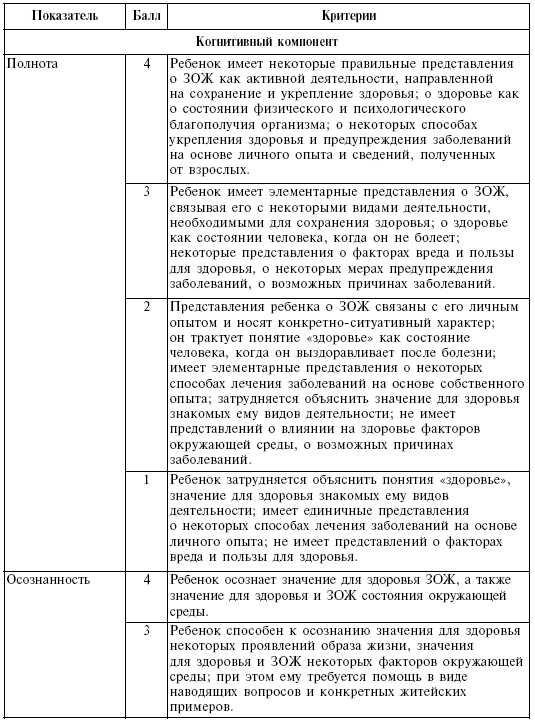 Дошкольники отличаются друг от друга по уровню развития познавательной деятельности, поэтому авторы пособия, частично опираясь на показатели и критерии оценки представлений о ЗОЖ, предложенные Л.Г. Касьяновой[1], разработали следующие показатели и критерии качественного анализа когнитивного и поведенческого компонентов представлений о здоровом образе жизни: полнота, осознанность, обобщенность, системность, инициативность, самостоятельность.
