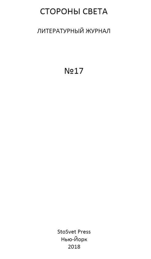 «СТОРОНЫ СВЕТА» ЛИТЕРАТУРНЫЙ ЖУРНАЛ №17 ОСНОВАТЕЛЬ И ГЛАВНЫЙ РЕДАКТОР Олег Вулф (1954 – 2011) РЕДАКТОР Ирина Машинская СОСТАВИТЕЛЬ 17-ГО ВЫПУСКА Катя Капович РЕДАКЦИОННАЯ КОЛЛЕГИЯ Лиля Панн Слава Полищук Валерий Хазин Роберт Чандлер ОФОРМЛЕНИЕ И ОБЛОЖКА Сергей Самсонов (1954 – 2015) КОРРЕКТОР Наталья Сломова ТЕХНИЧЕСКАЯ ПОДДЕРЖКА Хона Гордон PUBLISHED BY STOSVET PRESS, NEW YORK cp@StoSvet.net http://www.StoSvet.net ©2018, All Rights Reserved Все права принадлежат авторам
