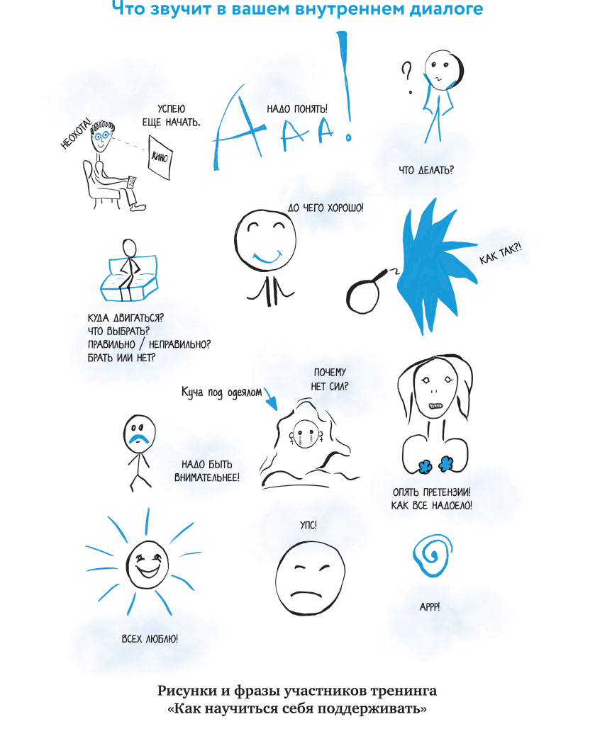 Иллюстрации в книге – это рисунки моих учеников, их наблюдения за своим внутренним диалогом, сделанные во время тренингов, мастер-классов и консультаций.