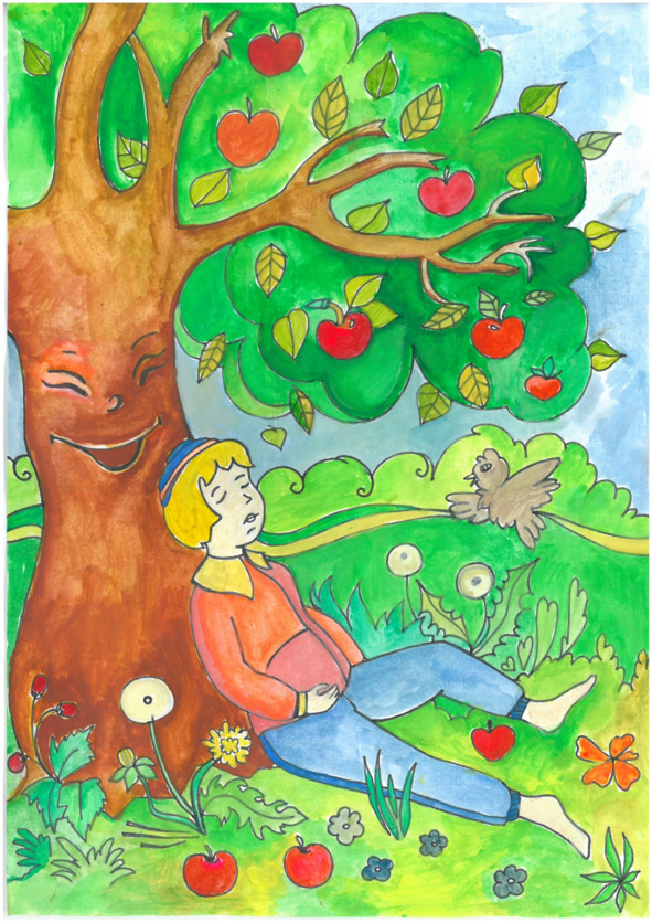 Шел он шел – есть захотел. Увидал яблоню – съел яблок несколько штук, голодный был, и заснул под деревом.