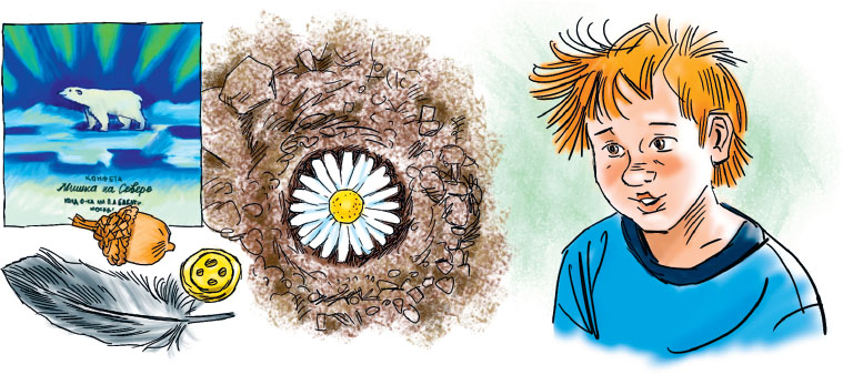 Возьми́те чи́стое стёклышко и вы́ройте в земле́ я́мку. Положи́те в я́мку фа́нтик от конфе́ты, а на фа́нтик – всё, что у вас есть краси́вого.