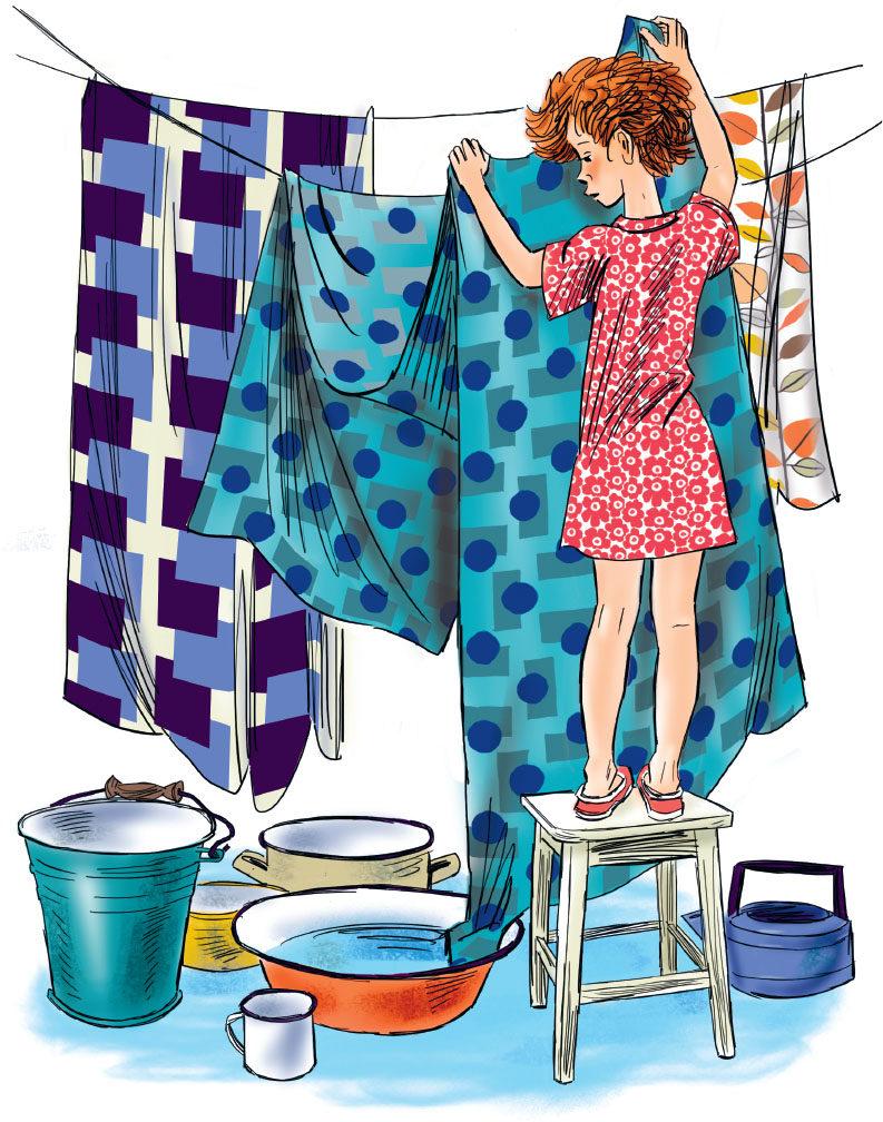 – Ты замеча́тельно вы́стирала занаве́ски! – сказа́ла ма́ма, расха́живая по ку́хне в гало́шах. – Я и не зна́ла, что ты така́я спосо́бная! За́втра ты бу́дешь стира́ть ска́терть…