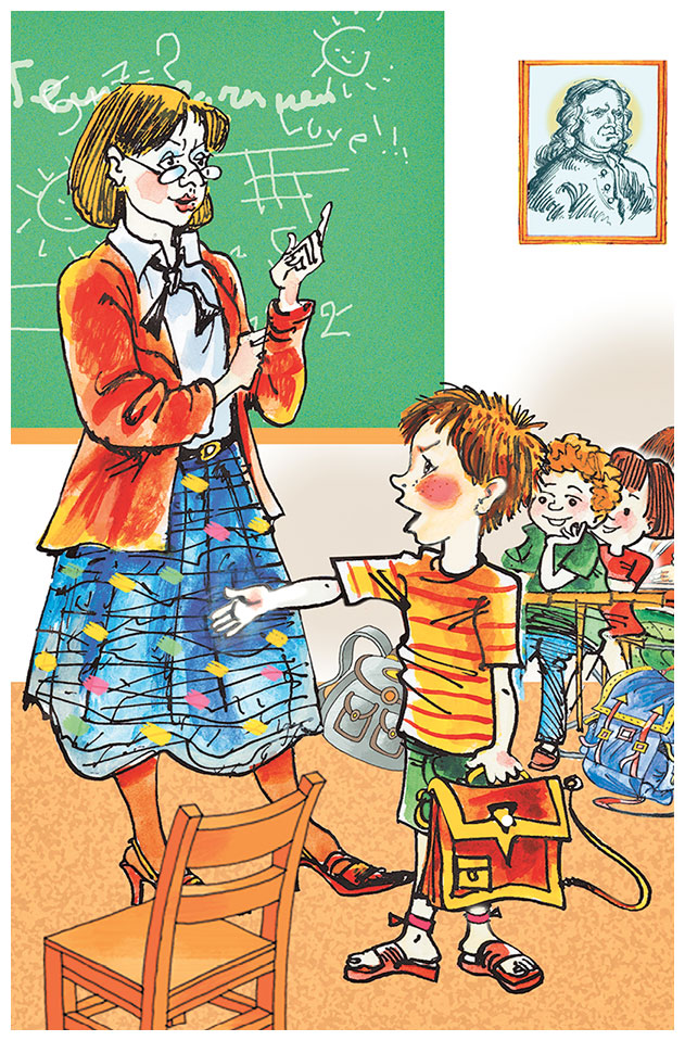 – Спасибо, Линейкина, садись. Дальше продолжит Котиков. Вася! Ты меня слышишь? Ты что, опять спишь? Мне, видимо, придётся специально для тебя носить в школу будильник.