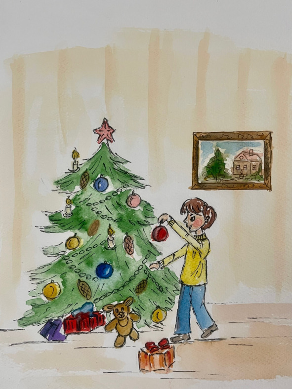 Мама пришла из магазина, папа вернулся с работы. Войдя в гостиную, они увидели наряженную ёлку: всю в разноцветных шариках, стеклянных игрушках, увитую гирляндой и блестящей мишурой. Папа включил вилку в розетку, и ёлка заискрилась, засветилась, преобразилась, повеселела.