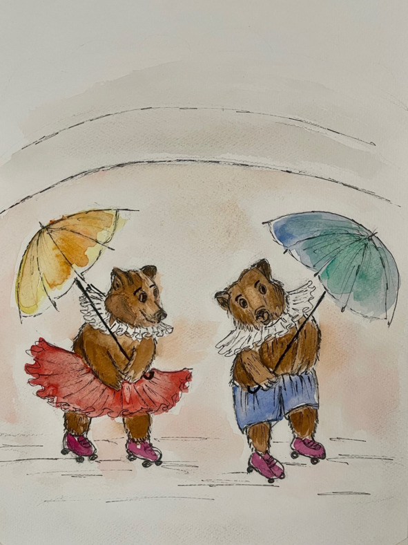 Как обычно на манеж выскочил смешной клоун в разноцветном костюме с огромным воротником-жабо и в колпаке с помпоном. Что-то прокричал, за громкой музыкой Сашка не разобрал. И тут на манеж выкатились маленькие медвежата. Ну просто совсем ещё детёныши. Один в платье и шляпке – девочка, а мальчик в штанах и тоже в шляпке. Оба зажимали в лапах открытые зонтики. Ну а самое главное, они были на роликовых коньках.