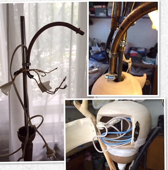 1. К металлической ноге торшера прикрепить три трубки для плафонов от старой люстры с подготовленными накрученными патронами для лампочек, провода протащить через трубки. Крепить трубки можно при помощи сантехнического зажима-хомута.
