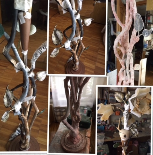 Трикотажные ленты пропитать в растворе клея ПВА+шпатлевка+лак на водной основе (1+1+1), обмотать все соединения сучков, веток, листьев, закрыть отверстия от шурупов, создавая полную иллюзию настоящих переплетенных между собой изогнутых веток. Дождаться полного высыхания. Покрасить коричневой акриловой краской. Просушить. Закрепить двумя слоями матового лака на водной основе.
