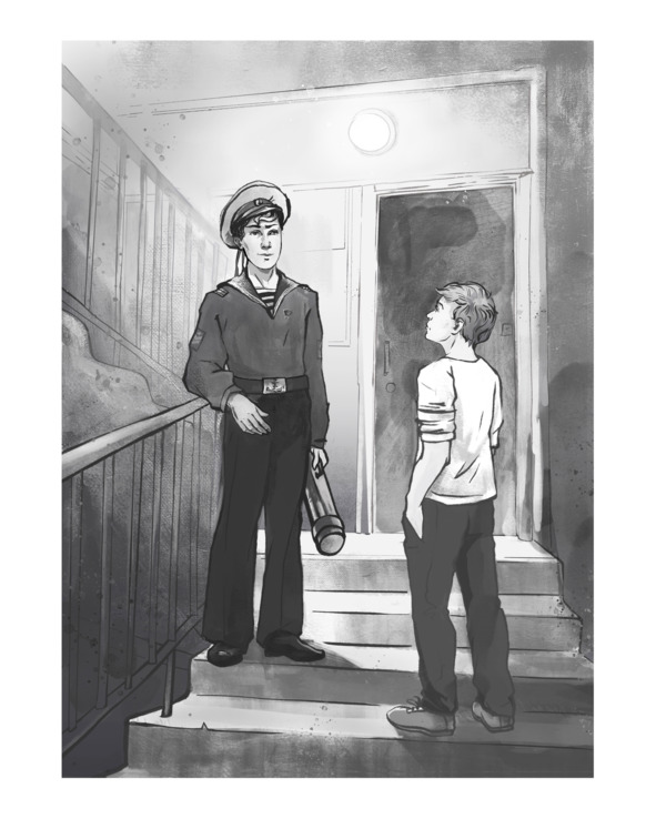 Блестела начищенная бляха флотского ремня. Над крашеным белобрысым чубом – форменная фуражка чуть набок. Новенький гюйс обнимал крепкую шею. Тельняшка – подруга ласково льнула к груди моряка. Парадная фланка с двумя нашивками на рукаве и широченные чёрные брюки со стрелками. Ладная фигура. И улыбка на лице, открытая, добродушная. Вот вам славный портрет соседа, каким увидел его Сергей, окинув взглядом снизу вверх : любит человек жизнь, и она ему взаимностью отвечает.