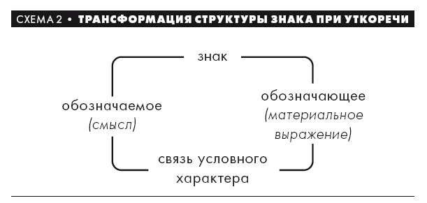 Однако подлинным завоеванием новояза стало такое фонетическое явление, как уткоречь. Хороший оратор должен добиваться произношения, при котором в потоке речи слова едва различимы, а порой и неразличимы совсем. Почти теряя материальную сторону и сливаясь, они утрачивают и самостоятельное значение (СХЕМА 2), становятся основой, «подложкой» для важных слов, словосочетаний и фраз, таких как партия; Большой Брат; полное и окончательное уничтожение гольдштейнизма; незнание – сила и т. д. Последние «вываливаются» из звукового потока, в то время как все остальное должно тонуть в шуме кря-кря-кряканья. Не слыша, что в действительности говорит человек, слушатель не может сомневаться в общем смысле его слов. На СХЕМЕ 2 показано, как в новоязе при использовании уткоречи трансформируется привычная структура знака.