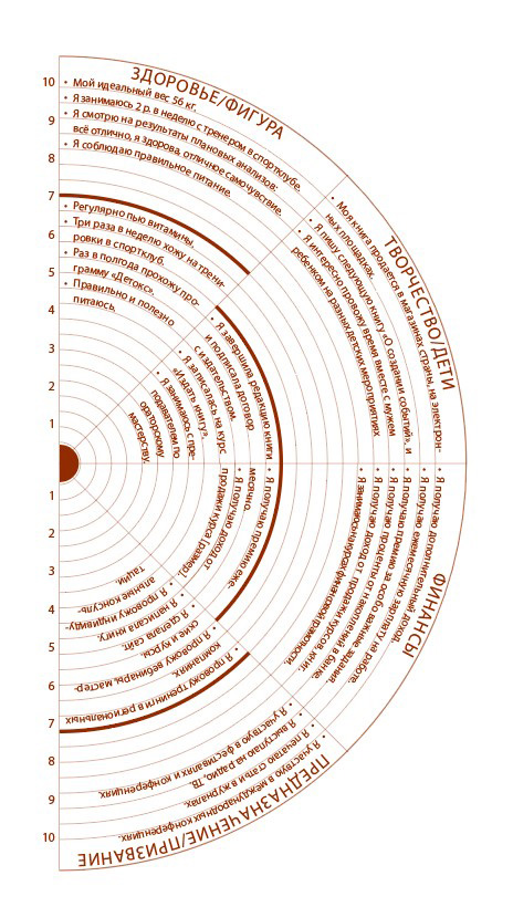 Обратите внимание – в данном упражнении чем конкретнее вы пропишете желаемые результаты, тем больше возможности их реализации. Например, если взять область финансов, пропишите конкретные суммы – лучше на 20 % больше от доходов в настоящем времени.