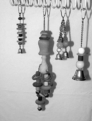 В клетке с кореллами желательно подвесить лесенку и качели. Выбирая их, следует пользоваться рекомендациями, приведенными относительно жердочек. Если в клетке живет только 1 попугай, а вы часто и надолго отлучаетесь из дома, желательно поместить в клетку игрушки. Это могут быть зеркальце, колокольчики, а также нанизанные на проволоку шарики.