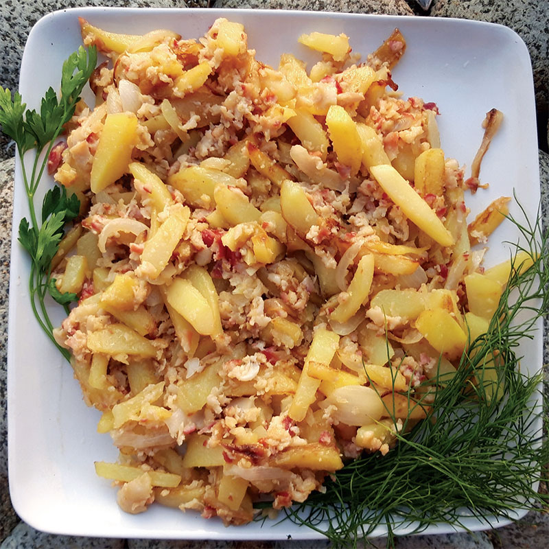 • Нарезать картофель и жарить на сковороде как обычно вы предпочитаете. Затем добавить нарезанный полукольцами репчатый лук. Минут за 5 до готовности картофеля добавляем спизулу.