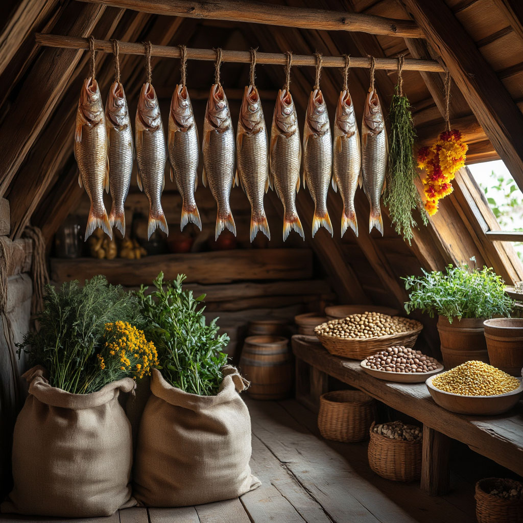 Вдоль стен на верёвках аккуратно сушилась рыба, источая солоноватый запах; под потолком, словно пёстрые гирлянды, свисали пучки душистых трав – мяты, зверобоя, ромашки; в больших холщовых мешках хранились запасы грецких орехов, пшена и фасоли.