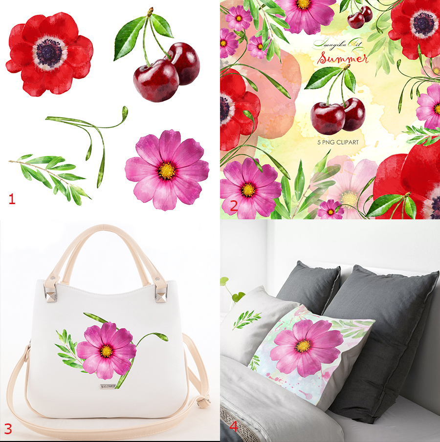 Посмотрите на рисунок 3. Здесь представлен пример набора клипартов на летнюю тему. Часть 1 – сами клипарты в формате png без фона, часть 2 – обложка для продажи набора клипартов, 3 – визуализация клипарта на сумке и 4 – на постельном белье.