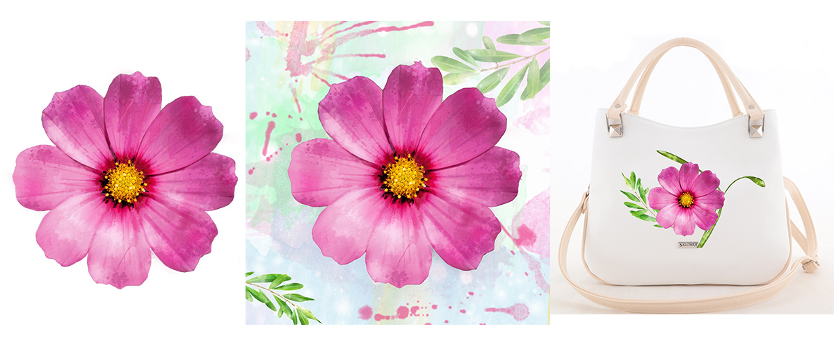 Рис. 15. Клипарт «цветок» без фона, на фоне и визуализация на сумке