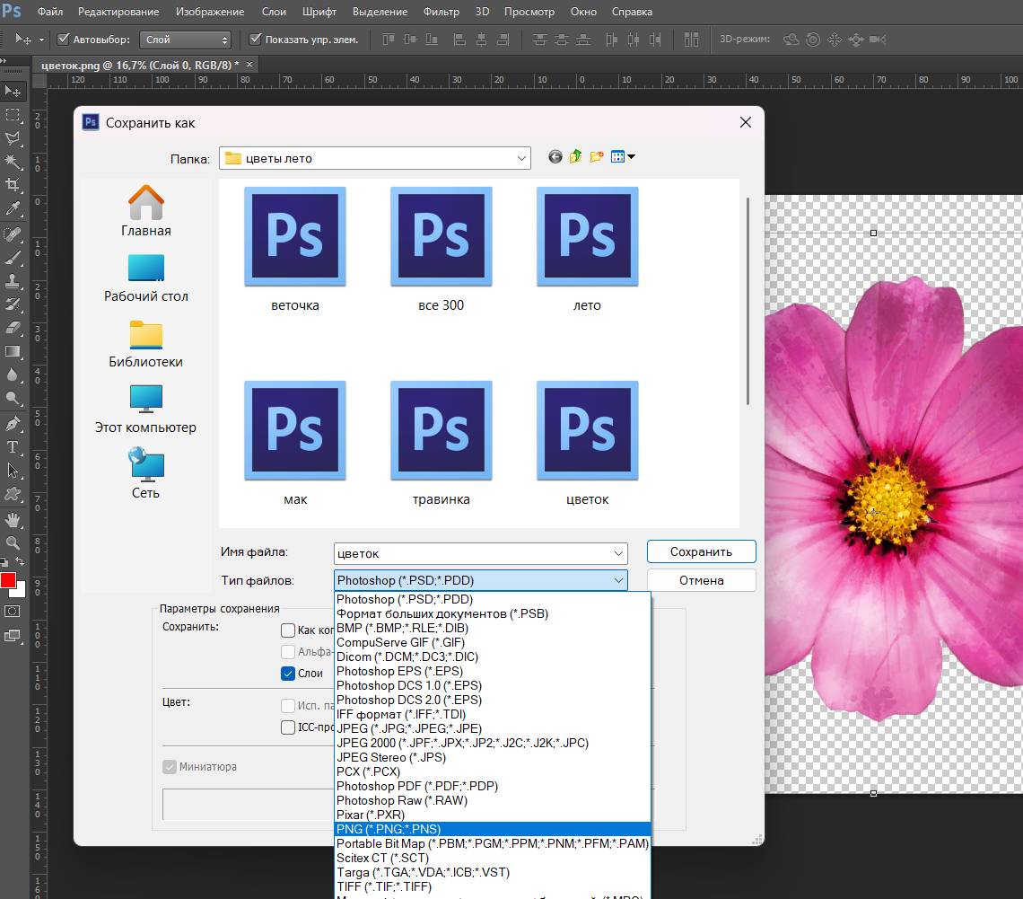 6. Создайте из картинки формат Пинг. Для этого откройте меню «Файл» – «Сохранить как» и выберите формат png как на рис. 18. (Тип файла png). Можете задать файлу другое имя, укажите вверху папку для сохранения файла. По умолчанию Photoshop сохраняет файл в ту папку, откуда вы взяли исходный файл. Но можете сохранить в любую папку или на «Рабочий стол» компьютера.