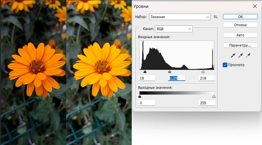 3. Сдвиньте ползунки «Выходного значения» к центру (темные и светлые тона), средние тона (серый ползунок) подвигайте влево или вправо, пока вы не получите желаемый результат. За счет команды «Уровни» изображение можно сделать ярче, контрастнее, светлее или темнее.