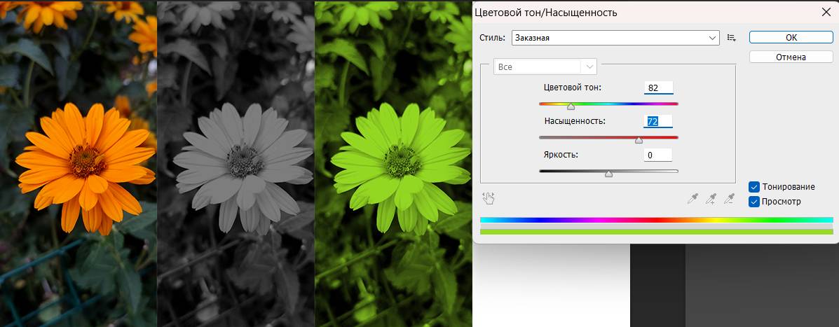 Рис. 21. Обесцвечивание фотографии и тонирование в команде «Цветовой тон/Насыщенность»