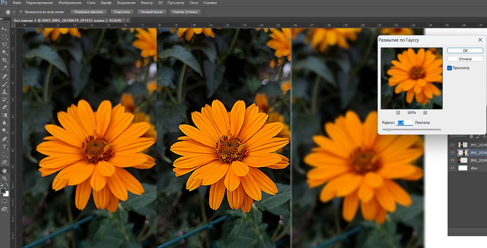 Находятся эти команды в меню «Фильтр» – команда «Усиление резкости» – «Резкость +» и чтобы сделать размытие или мутный фон надо также перейти в меню «Фильтр» – «Размытие» – «Размытие по Гауссу» и, передвигая маркер влево или вправо, задать радиус размытия. См. рис. 22.