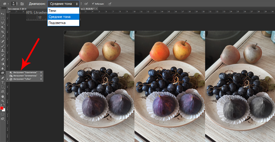 На рисунке 23 вы видите применение инструмента «Губка» к фруктам на фотографии. Вторая картинка – для яблока и инжира увеличена насыщенность цвета, на третьей картинке наоборот, уменьшена яркость цвета.
